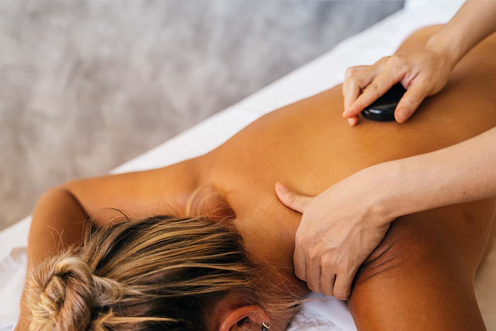 Bei der Hot-Stone-Massage werden flache Basaltsteine erwärmt und auf bestimmte Energiepunkte, entlang von belasteten Körperstellen und Meridianen gelegt. Ziel ist die Entspannung der Muskeln durch Warme und die Regulierung der Blutzirkulation.