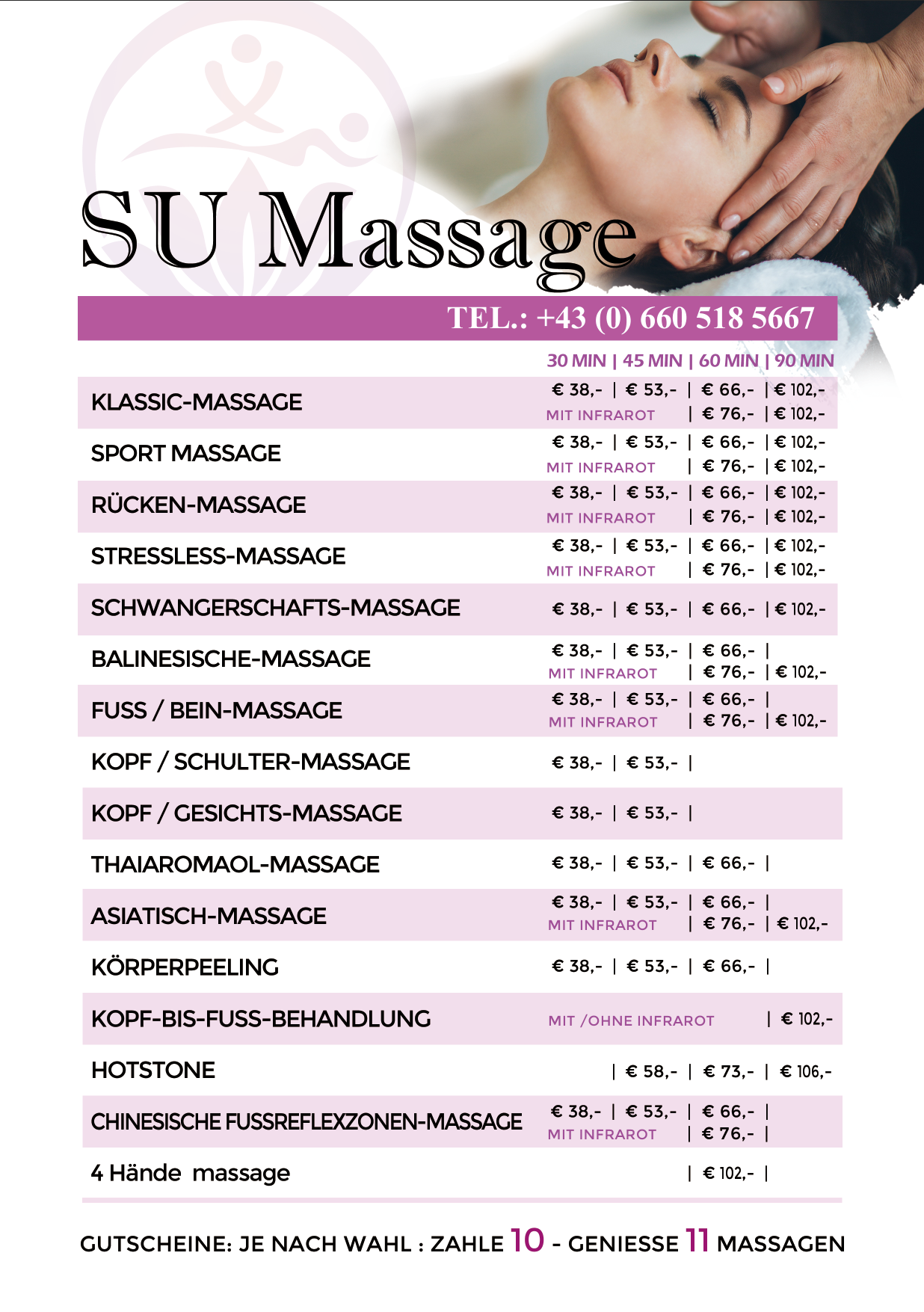 Bei uns können Sie Muskelverspannungen lindern, die Durchblutung verbessern, Stress abzubauen und die körperliche und geistige Gesundheit fördern. Wir bieten in der Regel eine komfortable Umgebung, in der Sie in entspannter Atmosphäre Heilung und Wohlbefinden erfahren können.